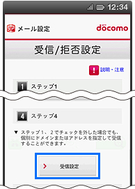 「迷惑メール対策」画面で「受信/拒否設定」の「設定」を選び、「次へ」を選択します。